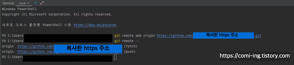 명령어 입력 시 fetch push에 각각 복사한 https 주소가 뜨면 잘 연결된 것입니다.